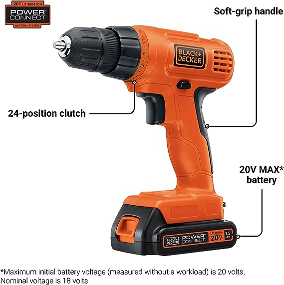 BLACK+DECKER 20V MAX* cordless drill/driver is up to the challenge of quick home repairs, DIY projects, and more. Use this compact, cordless drill/driver on wood, metal, and plastic. It’s designed with a 24-position clutch that helps keep you from stripping and overdriving screws for enhanced control over every project.